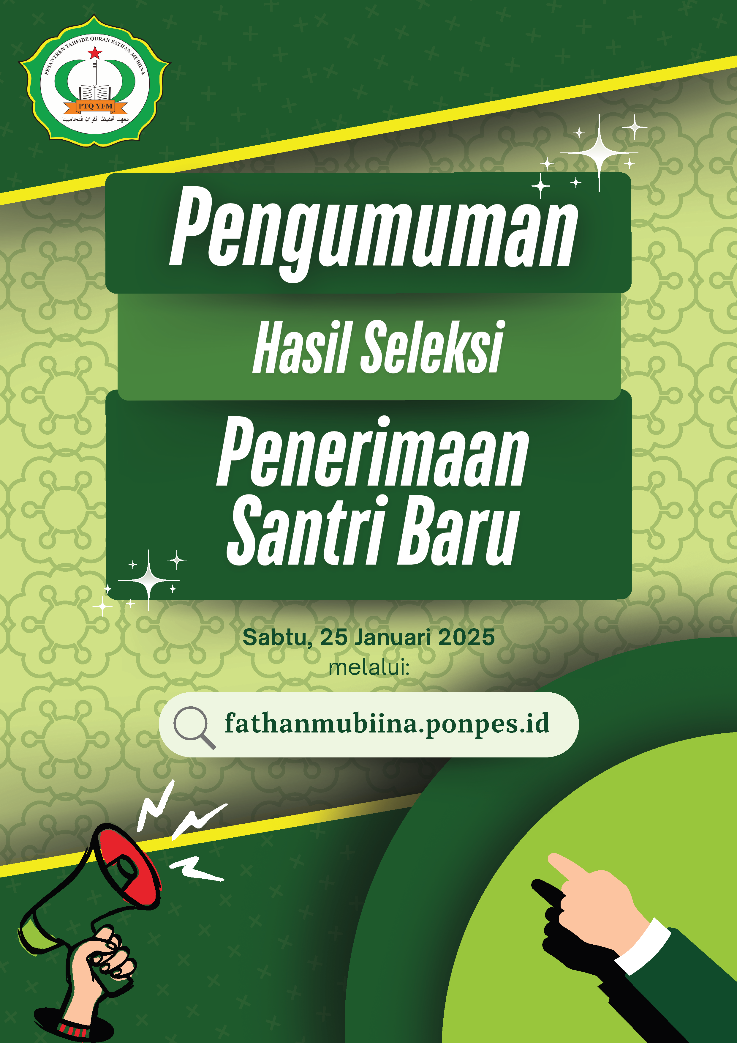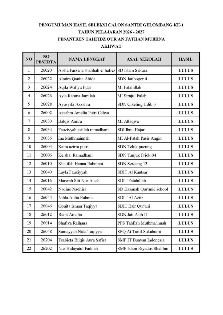 Kami mengucapkan terima kasih kepada seluruh pihak yang telah berkontribusi dalam menyukseskan acara ini. Semoga seluruh calon santri yang dinyatakan lulus dapat menjadi generasi penghafal Al-Qur’an yang berakhlak mulia dan bermanfaat bagi umat.