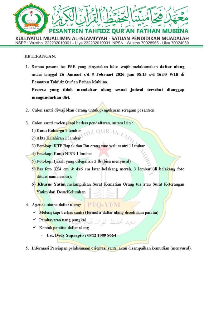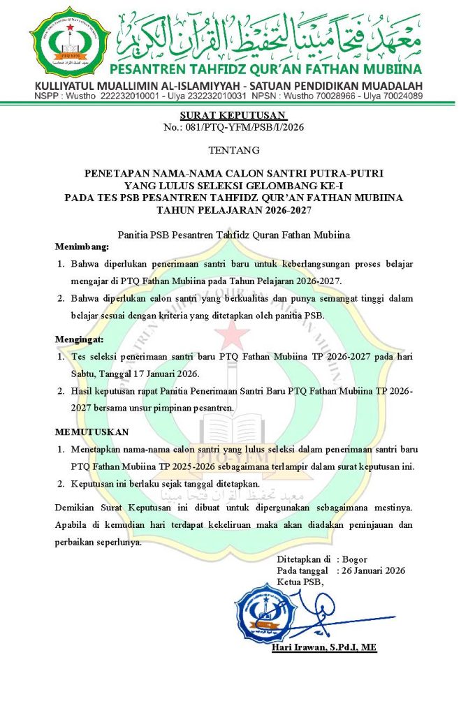 Tes ini meliputi penilaian kemampuan membaca Al-Qur’an, hafalan, serta wawancara untuk menggali potensi dan komitmen calon santri. Kami bersyukur atas semangat luar biasa dari seluruh peserta, yang menunjukkan harapan besar untuk menjadi bagian dari keluarga besar Pondok Pesantren Fathan Mubiina.